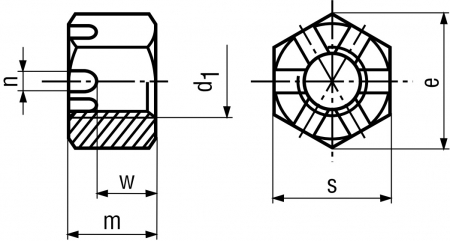 特長 相手材になるボルトに貫通穴を開け、ナットの溝と貫通穴を合わせて、そこにピンを通して緩み止めとして使用します。