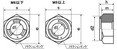 | 特長 | 六角ナットにフリクションリングと言われるリングがかしめてあります。おねじを締付けた際、リングにばね作用が働き、おねじに対して反発力が生まれ、緩み止め効果が得られます。 ※鉄のM14以上とステンレスは1種タイプ、鉄のM12以下とS45C・SCMは2種タイプになります。 同等品として、お得なセルフロッキングナット(SLナット)もございます。 |
