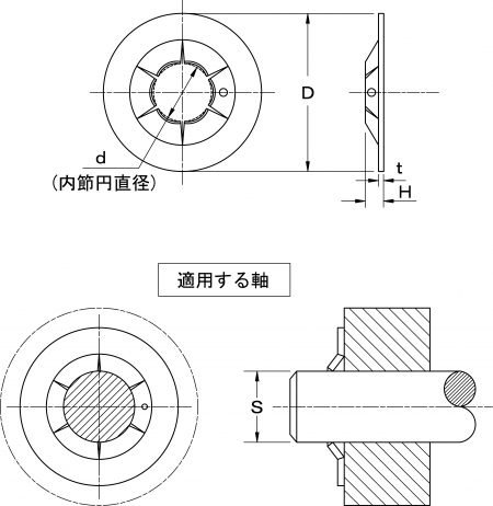 | 特長 | シャフト(軸)に挿入して部品の固定、位置決めや抜け止めに使用する"スラスト方向(軸と並行方向)取付けタイプ"の止め輪 で任意の位置で固定できます。内歯のある軸用と外刃のある穴用があります。 ストラス方向から軸に挿入し内歯のエッジ部が軸の表面に食い込こむことで自身を固定しストラス荷重を受け止めます。また挿入と反対方向へは動かなくなります。任意の場所へ簡単に設置でき軸への溝加工が必要ないのが特徴です。装着には専用工具が便利です。同様に溝加工なしで使用できるCS形止め輪との比較では接触する面積が大きくより大きなスラスト荷重に耐えることができます。逆にCS形止め輪の方が相手材を傷つけにくく挿入抵抗は小さくなります。再利用は相手材から取り除くために止め輪自身を変形あるいは破壊しなければならないので出来ません。 相手材の硬さが高い場合や表面処理により硬い皮膜がある場合は使用できない場合があります。 サイズ選択は下記適用軸径(S)をご参照ください。 |
