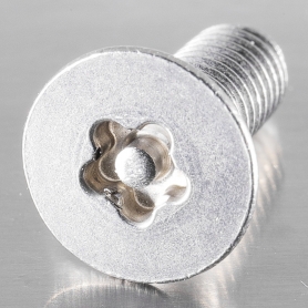 | 特長 | 「いたずら防止ねじ」(盗難防止ねじ、タンパープルーフねじ、)としてコンピュータ・ビデオなどの電子機器、公園遊具・自動販売機・計測機器などの屋外施設、また保安機器・装置の意図しない分解・改造・いたずらの防止、安全対策や盗難の防止に使用します。展示会のディスプレー、ホテル設備(時計、ラジオ、TV)などのインテリア等デザインが気になる場所にも適しています。 リセス形状は六角形や+・−でなく梅花状の5ロブ穴(英lobe 耳たぶ 丸い突出部)にセンターピンが付いています。特殊な形状のドライブなので取り外しには専用の工具が必要です。専用工具は個人には販売されておらず一般人には入手困難です。また皿ボルトなのでザグリ加工やローゼットワッシャを使用しての締結後は、ねじ頭部をペンチ類で直接掴んで回すことが出来ず「いたずら防止ねじ」として非常に効果的です。センターピン付6ロブ皿キャップのような他の形状のリセスのねじ・ボルトと組み合わせるのも有効です。 ※締め付け工具はこちらでご購入いただけます。ねじサイズと同サイズの工具(例ねじM4―工具M4)の組み合わせでのみご使用いただけます。 |