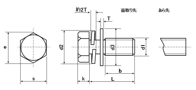 特長 六角ボルトばね座金平座金(旧JIS規格)を組み込んだ、六角トリーマP=3、座金組込六角ボルトP=3とも呼ばれるボルトです。3つの部材(英Piece)で出来ているため[P=3]の略称をつけて呼ばれるようになりました。
