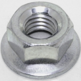 | 特長 | フランジ付ナットやフランジ付き六角ナット、座金一体型ナットなどとも呼ばれます。幅広のフランジ(つば)が六角ナットの座面の片側に付いており平座金の役割を果たし緩み止め効果を期待でき締結後の外観も良好です。フランジ着座面がフラットなセレート無しの為、塗装面等の柔らかな被締結材表面を傷つけません。 ねじ締結はボルト・ねじ軸部が引っ張られることで発生する張力(軸力)と、被締結材が圧縮されることで発生する反発力(圧縮力)が釣り合って保たれる(これを予張力と呼びます)ことで結合しています。振動によって生じる緩み回転や被締結材の強度不足による陥没は軸力を低下させねじを緩ませます。平座金の様な広い着座面積を持つフランジナットは座面の圧力を下げ被締結材の変形、陥没を防ぎ、高トルクで軸力を高めたねじ締結は振動に強くなります。また、長穴でも十分な着座面積を確保することも出來、平ワッシャーの組み込み不要ですので部品点数や作業工程が減り作業効率が向上します。 セレート付はこちらからご購入いただけます。 |