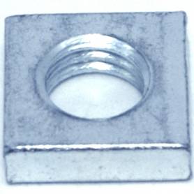| 特長 | フラットナット(英 flat nut)とも呼ばれる正方形のナット(めねじ)です。樹脂成形品やプレス等の金属品に形作った空間にセットし、おねじ(ボルトや小ねじ)を組合せて締結します。同様の正方形のナットの四角ナットと混同されやすいですが、板ナットの方が板厚が薄くなります。板ナットは鋼板をカットしたものにめねじを立てたとして板の厚さが基準になっていますが、四角ナットは六角ナットを四角く作ったとされ、高さ(厚み)や対辺が六角ナット1・2種の規格に準じています。 六角ナット同様おねじと組み合わせてねじ締結を行います。薄い為あまり強度が必要でない箇所で使用します。六角ナットの場合、ボルトとナット両方を工具で固定しなければ締結出来ませんが、正方形状は対角距離が長く引っ掛かり易く回転しないのでので、溝や間隙に嵌めたり角に合わせたりすれば締結の際に抑える必要が無いという利点があります。また角や溝に嵌めて使用すれば締結後も不要な回転をしません。 サイズ欄は【呼び径×対辺×高さ(厚さ)】です。ねじ山はメートルねじ並目です。 |