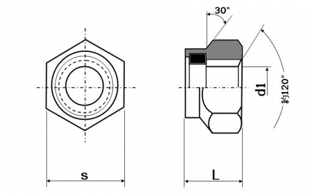 特長 六角ナットに先端部にナイロンがかしめてあるナットです。おねじがナイロンへ食込み、緩み止め効果が得られます。車両関係・機械等の振動の多い場所へ使用します。
