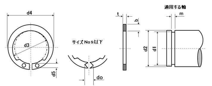 | 特長 | シャフトの円周状の溝へはめ込んで部品の固定や位置決め抜け止めとして使用する"スラスト方向取付けタイプ"の止め輪 軸用です。取付けた時にラグ(取付け作業用の突起部)の出っ張りがなく外周が軸と同心円の円となるので止め輪の外側へほかの部品を使用することができます。 使用法は軸用C形止め輪と同じですが軸との接点が異なります。C形止め輪は内周全体で溝と接しますが丸S形止め輪は溝に2個のラグと反対側の内周の三点で接するため、耐える事のできる軸方向の荷重(スラスト荷重)が約2/3になります。 取り付けには止め輪用工具を用います。ラグの小さな穴に工具先端を差し込んで外径を広げて軸に通し、スラスト方向に(軸方向と平行に)溝の位置まで移動させ開放して溝に嵌めます。ガタツキの原因となるため再利用はしません。 取付け側先端部が直線のC形止め輪用プライヤー 軸用と先端がL状に曲がっているC形止め輪用プライヤー 軸用 L型があります。軸用取付工具は工具先端がグリップ部を握ることで開きます。 軸用の呼びサイズは軸の径です。 |