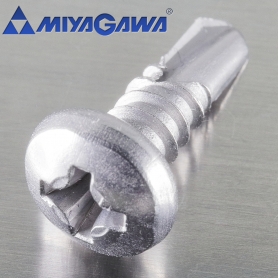 | 特長 | 高品質を誇るミヤガワブランド製品です。 FRXシリーズのドリルねじは下穴無しで板厚12mmの鉄板への打ち込みも可能なMRXドリルねじの抜群の切れ味を引き継ぎつつも低コストを実現しており、一般建築用として広く用いられています。こちらはなべ頭ですが、薄板に適する細目や高トルクで締結できるHEX(六角頭)、サイディング用にシンワッシャーなど目的に応じてお選びいただけます。 一般にドリルネジ(セルフドリリングスクリューとも)は部材を鋼板等に止める締結部品として建設や金属製品の組立等に使用します。タッピンねじの先端部をドリル刃とし、下穴あけ・タップ立て(めねじ加工)・締結をねじ一本で行える利便性を持ち、下穴加工・めねじ立ての工程を省けドリル・タップ等の工具が不要でコスト削減に貢献します。 サイズは「呼び径(d1)×呼び長さ(L)」で呼び長さに頭部の厚みは含みません。 適用最大板厚は呼び径3.5では2.3弌4は3.2(4×10は2.3)、5は4.0个任后 長さは【接合材料の厚み+ドリル部+5〜10mm】を目安に出来ます。 |