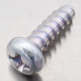 | 特長 | なべ頭の為タップタイトBタイトなべやBタイトなべとも呼ばれます。相手材下穴へ塑性変形によりめねじをセルフタップタッピングして形成しながら締結するタッピングねじの1種で胴部分が三角形(おにぎり形状)です。Bタイトは2種(B)タッピングの改良型でねじピッチは2種(B)タッピングと同じでやや粗いです。薄鋼板(0.6〜3.2mm)やプラスチックなどへの使用が出来ます(2ピッチ以上の嵌合が必要)。 利便性の高いタッピンねじの「ねじ込み時の抵抗が大きく作業者への負荷が大きい」「締め付けトルク損失が大きく軸力が小さくなる」という課題を、タップタイトは胴部をおにぎり形状(三角形)にすることで解決しました。締結の際に三角形断面の3つの頂点が相手材を押し広げてねじ面との接点が限定されることで内部応力が緩和され作業性が向上、高い締め付け力が得られ軸力を高めます。締結後は三角形の辺部分に相手材が収縮復元されることにより抵抗を受け、振動・衝撃に対して高い緩み止め効果を発揮します。 |