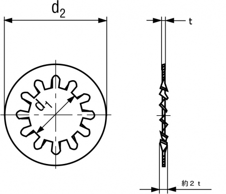| 特長 | 内歯付座金や外観を菊の花に見立てた菊座金の名称もあります。ロックワッシャー、スターワッシャーとも呼ばれます。歯付き座金は内側または外側に突起をつけ、突起を45°程絞り立ち上げ「歯」とした座金で、締結の際ねじ・ボルトの頭やナットと被締結材の間に挟み込んで使用します。この「歯」によりねじやボルトを締め込んだ際にスプリング作用が働き、また「歯」が接合面に食い込むことによりねじの緩み防止・回り止めとして働きます。また相手材表面を傷付けることで電気的な導通確保をする為にアース端子の取付部に使用することもあります。内側に突起があるものを内歯付座金と呼びます。内歯付は締結後に外周に傷などを見せたくない場合に使用します。内歯付のほかに外側に歯のある外歯付き、内外両側にある内外歯付き、皿頭に使用することのできる皿形歯付きがあります。 ボルトとワッシャーの呼び径を合わせてご使用ください。(М10ボルト→М10ワッシャー) |