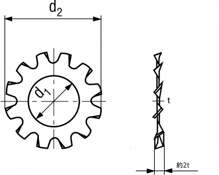 | 特長 | ロックワッシャー、スターワッシャーとも呼びます。見た目から菊座金の名称も付いています。外側に突起がある物を外歯付座金とも呼びます。 歯付ワッシャーは外側や内側に歯をつけ、その歯を絞り立ち上げた突起を持つ座金です。他の座金と同様に締結の際ねじ・ボルトやナットの着座面と被締結材の間に挟み込みます。この「歯」がばねとなり反発力を生み、また接合面に「歯」が食い込むことでねじのガタツキや緩みを防止し、回り止めとして機能します。またアース端子の取り付け部などでは相手材表面の塗装や皮膜を傷付け電気的な導通確保を目的に使用することもあります。 外歯付は内歯付よりも歯数が多く緩み止めとしてより効果的とされています。またボルト穴が大きい場合や接地面積を大きくしたいときにも用います。外周に傷などを見せたくない場合には内歯付を使用します。他に歯が内外両側にある内外歯付き、皿頭小ねじに使用することのできる皿形歯付きの歯付座金があります。 ボルトの呼び径とワッシャーを合わせてご使用ください。(М10ボルト→М10ワッシャー) |