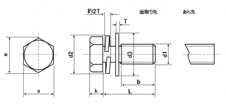 | 特長 | 座金組込六角ボルトP=4や六角トリーマP=4とも呼ぶトリーマセムスP=4は別名通り座金(ばね座金2号と平ワッシャーJIS小形)を組み込んだボルトです。通常の座金のように座面陥没を防いだり緩み止めの効果があります。アセンブリの際の座金組込みの手間を省き、組込み忘れのミスをなくします。六角ボルトから座金が抜け落ちないことで作業能率を上げ、トータルで時間と労力を節約できます。 座金が抜け落ちない理由は製造過程にあります。六角形の頭を成型したブラインド(ねじ山のないボルト)に、スプリングワッシャーと平ワッシャー(JIS小形)を組み込んでからねじ山を転造にて成型します。切削加工と異なり転造加工後はねじ山が盛り上がるのでワッシャーの内径より大きくなり座金は抜け落ちなくなります。 トリーマセムスには平座金だけ組込まれたP=1、ばね座金だけ組込まれたP=2、平座金(旧JIS)とばね座金を共に組み込んだP=3 そして平座金がJIS小形の本品P=4と使用目的に応じてお選びいただけます。 →平座金の規格一覧はこちら |