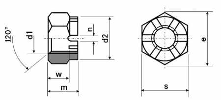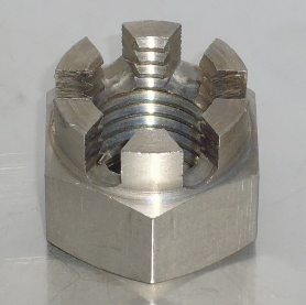 | 特長 | キャッスルナットやキャッスルナット2種高形など外観をヨーロッパの古城に見立てて呼ばれる溝付き六角ナットは、割ピンなどと併用して効果を発揮する緩み止めナットとして用いられています。 2種高形は六角ナットの片側を円筒状に延長し、放射状の溝が刻まれています。割ピンを広げた際に円筒部に巻き付けることでピン足が六角形の外側に露出せず安全な為、溝付きナットでは最も流通している形です。1種は六角ナットの片面へ直接溝が刻まれた姿をしています。1種2種共に厚みのある高形と薄い低形があります。 締結した後、ボルトに開けた貫通穴(ピン穴)とナットの溝へ割りピン等を通してボルト・ナットが互いに対して回転出来なくすることで緩みを防ぎ、また万一緩んでもボルト・ナットは分離せず脱落を防止します。施工やメンテナンスに手間が掛り習熟も必要でコストがかかる為、用途によっては施工の簡単な緩み止め製品へ置き換えがなされています。 ※本商品のみでは緩み止めとして機能しません。 |