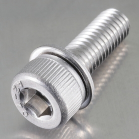 | 特長 | 本品はキャップセムスP=1(キャップボルトにJIS平ワッシャーを組込んだアセンブリ)のワッシャーをJIS小型ワッシャーに置き換えたものです。名称に小型を意味するKが加え六角穴付ボルトPK=1、キャップセムスPK=1とよびます。 キャップセムスとも呼ばれ、ねじの製造時、省スペースで締結力に優れた六角穴付ボルト(キャップスクリュー)に座金を組み込んでアセンブリとし、緩み止めや座面の陥没を防ぐ効果が期待できます。転造によってねじ山を成型する前に座金を組み込むため、座金がボルトから外れません。アセンブリであるので座金の組込忘れは無く、組込の手間が省け、座金を落としてしまう煩わしさが解消されます。作業効率を上げ、時間と労力を節約でき経済的です。 セムスねじ・ボルトには平座金だけ組み込まれたもの、平座金とばね座金を組み込んだものなどの様々な種類があり、目的により選べます。部材(英Piece)2個(六角穴付ボルト、ばね座金)で出来ているアセンブリを[P=2]、部材3個(六角穴付ボルト、ばね座金、JIS規格平座金)のアッセンブリを[P=3]と呼ぶようになりました。 平座金(JIS規格)のみのアセンブリは[P=1]、ばね座金とJIS小形平座金のアセンブリは[P=4] と [2][3]以外の数字を当てました。これを基本にISO規格の[I]、小形の[K]、等を組み合わせで呼ばれています。 |
