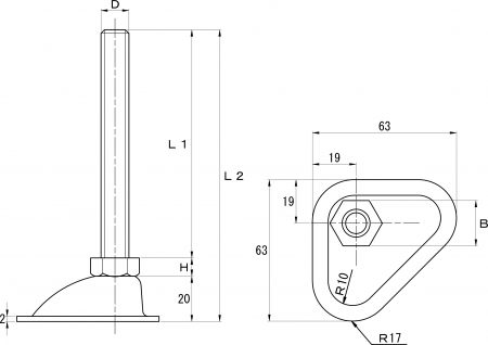 | 特長 | アジャストボルトはアジャスターボルト、アジャスターとも呼ばれ、自動販売機や機械設備、パーテイションなどの脚部に水平保持や高さの調節を目的に設置する、上下の調節が出来る受座の付いたボルトです。こちらは壁際、コーナー部専用です。壁にピッタリ寄せて設置できるので、しっかり固定でき、外観もすっきりします。 また他にも標準タイプや重量物用、家具用、など様々なタイプがありますので用途に合わせてご選択いただけます。 ※サイズは『D×L1』となります。 標準タイプの耐荷重はカタログ23ページにてご確認いただけます。例:スチール製M12の耐荷重は1800圈▲好謄鵐譽浩州16の耐荷重は3600圓任后 |