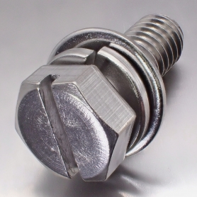 | 特長 | トリーマセムスP=3のすり割り付けで、マイナスドライバーでも締付けが可能なタイプです。 六角ボルトにばね座金と平座金(旧JIS規格)を組み込んだ、六角トリーマP=3、座金組込六角ボルトP=3とも呼ばれるボルトです。3つの部材(英Piece)で出来ているため[P=3]の略称をつけて呼ばれるようになりました。 ボルト頭部をトリミングで六角形に打ち出した後(トリーマ)、座金を組み込んでからねじ山を転造成型する為、ねじ山が座金の内径より大きくなり外れません。座金組込の手間を省き、組込忘れを防止します。また、座金を落としてしまう事へのストレスから作業者を開放し、能率を上げて時間と労力を節約します。 「セムス」は英語“pre-asSEMbled washers and screws(組み込み済みのワッシャーとねじ) " に現れる文字列“SEM” に複数形の“S” をつけ“SEMS” としたITW社(イリノイツールワーク社 1930年代に座金組込ねじを開発、特許を取得した)の登録商標から来ています。 →平座金の規格一覧はこちら |