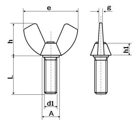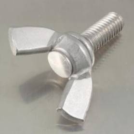 | 特長 | 蝶ボルトは蝶ねじ・ちょうボルトなどとも呼ばれる手で簡単に締付ける事のできるつまみ付きのねじ・ボルトです。つまみの部分が蝶の羽のような形状をしているためにこのように呼ばれます。英語ではこの部分を翼に例えて“wing bolt(ウィングボルト)”と呼びます。食品機械・医療機器・工作機械・農業機械・照明器具その他脱着の繰り返しが多い締め付け強度が不要な場所で使用されています。 蝶ボルトは1種〜3種まで規格があります。1種(つまみ端が半円形)と2種(つまみ端が角型 つまみが小型のRタイプ つまみが大型のHタイプにさらに分けられる)はつまみ部分が重厚で高級感があります。3種(つまみが鋼板からのプレス加工 中が空洞)は比較的軽めで安価です。つまみ部分の製法は1種2種が任意、3種はプレス加工と規定されています。本品はつまみ部分が冷間圧造の角小型、並目のメートルねじになります。 |