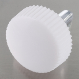 | 特長 | 使用時の意匠性が高い頭部の錆びない手締め用化粧ねじです。艶のある白色樹脂で頭部を覆い、滑り止めのローレット加工が周囲に施してあるので指で摘まんで容易に着脱できます。本品L-1は頭部径がφ20mm(呼び径M6)、L-2の頭部径はより大きくφ25mm(M6)なり力強く締結出来ます。そして頭部径が小型の1(Φ11mm M3〜4)、2(14mm M4〜5)、3(17mm M5〜6)と豊富な頭部径が揃っており目的に合わせてご選択いただけます。また同形色違いの黒ナイロン化粧ねじもございます。 つまみ部は熱可塑性樹脂のナイロン(ポリアミド PA)で成形しており、金属製の化粧ねじ(ローレットねじ)よりも非常にリーズナブルでかつ軽量です。軽量でありながら強靭性、耐衝撃性、電気的特性や耐摩耗性に優れています。また、耐薬品性や耐油性も優秀で耐老化性があり長期間使用しても美しい外観を保ちます。RoHS2,REACH規制等にも対応しており家具、照明器具、電気機器、事務用機器、ディスプレイ用器具、医療機器や介護用品にも利用できます。 |