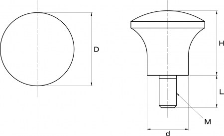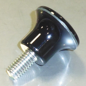 | 特長 | ボルト頭部に黒色フェノール樹脂で把手(ノブ)を成形しているつまみネジ(手締めボルト)です。頭部は握りやすさを追求した形状で、マッシュルームのような見た目をしているのでこの名称で呼ばれています。光沢のある仕上がりは美しくて汎用性が高く、押したり引いたりする操作ノブや部品・治具の把手として最適です。頭部径はΦ18〜Φ34までの4種類から選ぶことが出来ます。こちらはおねじ(ボルトタイプ)ですが、同形のめねじ(ナットタイプ)もあります。 ボルト部の部材は鉄(三価クロメート)です。 フェノール樹脂(石炭酸樹脂とも呼ばれる)は、初めて実用化された熱硬化性の人工合成プラスチックで、長年利用されてきました。光沢があり、着色性、機械的な強度、絶縁性に優れ、耐熱性、耐溶剤性、耐酸性のある樹脂で耐老化性にも優れています。比較的安価で照明器具、電気機器、事務用機器、ディスプレイ用器具等に利用されています。 |