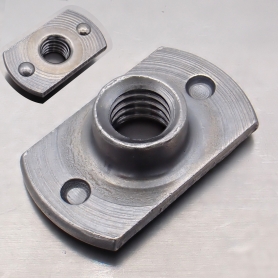 | 特長 | 薄鋼板など雌ねじを形成するのが困難な箇所へ溶接します。 横から見ると“T”のような形状の為T型の名が有ります。T型ウェルドナット(T型ウエルドナット)とも呼ばれます。T型溶接ナット1B型の数字「1」はプロジェクション溶接用―ダボと呼ばれる突起部(プロジェクション)が2つ有る「ダボ付き」―を表します。アルファベット「B」は位置決め用のガイド「パイロット (P)」が無いこと意味します。パイロットが無い為裏面に使用してネジ穴の存在を感じさせない仕上げを行えます。T型溶接ナット1A型はP付き・ダボ付きとなります。 T型形状には、フランジ面が締結部を補強し母材の薄鋼板の変形を防ぐ、通電・溶接はフランジ部でするためネジ部の変形や歪みが無い、溶接面が広く振動に強い、フランジ面積が大きく面圧が抑えられるので高トルクでの締結が行える、強度に影響ない部分の肉厚を削る為軽量かつ十分な補償荷重を得られる等メリットが数多く有ります。 溶接ナットは振動に強く薄板に最適なT型タイプの他、六角タイプや四角タイプが有ります。 |