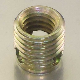 | 特長 | 小外径三つ穴、短寸タイプのエンザートです。小外径タイプは内ねじと外ねじのピッチが同じです。 三つ穴切り刃のエンザート307型より肉厚が薄く、外径が小さくなっています。そのため設置に必要なスペースが小さく、機器全体をコンパクトにすることが出来ます。快削性のあるアルミダイカストや割れやすい硬質樹脂の小型部品などに適しています。標準タイプより呼び径同じ(内径同サイズ)の場合に各種機械強度が低下します。 手作業でも小径用専用工具(ハンド加工用6101型)を利用して挿入加工が出来ます。工具先端のスタッドで三つ穴を塞がないように調整してください。6101型使用の場合、先端部が長すぎるならグラインダー等で削り調整します。呼び径サイズ毎に専用工具が必要になります。挿入の際には三つ穴を必ず下(ワーク側)にし、下穴と芯合わせを行い、1〜2ピッチ挿入時に必ず90°離れた2方向から垂直を確認します。加工途中での立て直しは不可です。 長寸タイプ(エンザート348型)もあります。 ※クロメート(画像)は廃番となりました |