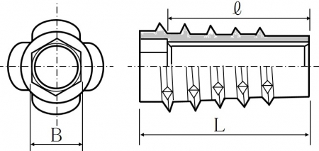 | 特長 | 組立て・解体や部材の着脱を繰り返すノックダウン方式家具にめねじを設置するための木材用インサートナットです。現地での高強度・高精度の組み立てを誰でも簡単に行える製品を可能とし、テーブル脚の様に脱着を繰り返す接合箇所には最適です。 鬼目ナットは大きく「つば付・つば無し」と「打ち込み・ねじ込み」にタイプ分けられます。Eタイプは「つば無し・ねじ込み」式です。比較的硬い母材に施工するのに適しており、六角レンチ等を使ってねじ込み、安定した締め付けが可能です。外周ねじ部には切り欠き溝があり、独立したねじ山が母材に食い込み固定され戻りや緩みを防ぎます。また、つば無しの為本体を完全に木材へ埋め込め、高い密着性が得られます。またテーパー形状は挿入抵抗が少なく、木材の割れを防ぎ真直ぐねじ込み易くなっています。 ※鬼目ナットについてさらに詳しくはこちらをご参照ください。 ※サイズは『d×L』となります。 ※木材におねじを付ける場合にはハンガーボルトが便利です。 ※材質の“鉄”は『亜鉛合金ダイカスト』となります。 |