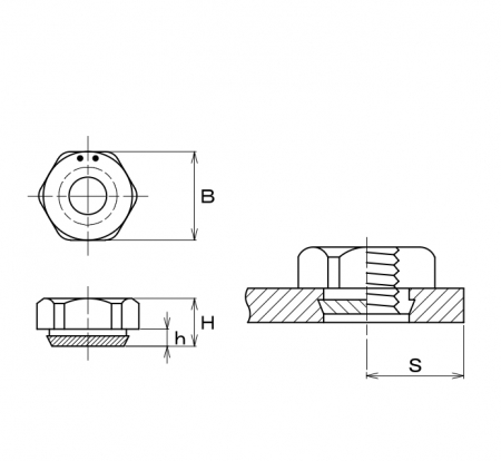 | 特長 | 溶接に不向きなアルミ・ステンレス等の薄板や小さな端面距離の部材等にめねじを圧入方式で設置出来るカレイナットのステンレス母材用(マルテンサイト系 使用母材硬度Hv200以下)です。首下部分に母材に「ナール」と呼ばれるゆるみ止めの為のギザギザ形状と抜けを防止する溝部で母材にしっかり固定されます。高い取付け強度が得られステンレス薄板にめねじ加工をするのに最適です。RoHS指令適合品です。 カレイナットならバーリング加工によるめねじより締結部強度が高く高耐久になります。バリは発生せず加工の工程を減らすことが出来、また複数個の同時挿入が出来るので作業能率が上がります。溶接ナットと比較しても、溶接で生じるスパッタ等が無く掃除は必要ありません。歪みにくく誰でも加工でき仕上がりがきれいです。良好な仕上がりを手間をかけずに得ることが出来ます。 プレス加工の下穴への圧入はパンチ側からが基本です。ダイス側には破断部がスカート状に広がって成形される為、厚板のダイス側より使用される場合は開口径が広がっている場合があります。 |
