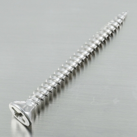 特長 皿頭の様な直線的な頭部形状をしている内装工事用のビスで着座面に突起があります。軽鉄用ビス、ドライウォールスクリューやワンタッチビスなどとも呼ばれます。フレキシブルボード(フレキ板 繊維強化セメント板)、ケイカル板(ケイ酸カルシウム板)等の建築内装工事に使用されるボード類を“天井ランナー”“間仕切りスタッド”などの軽天材(壁や天井などの下地に使用される厚みが0.5弌1.0伉度の薄い軽鋼板)の下地への貼り付けに用います。ボードドライバーや電動スクリュードライバーで下穴なしで取り付けることが出来ます。頭部をボードに沈めることが出来るのでフラットに仕上げることが出来ます。