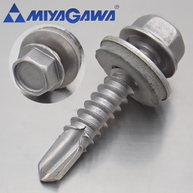 | 特長 | 高品質を誇るミヤガワブランドです。 下穴無しで板厚12mmの鉄板への打ち込みも可能なMRXドリルねじの抜群の切れ味を引き継ぎながらコストダウンしたFRXドリルねじシリーズ。一般建築用ドリルねじとして広く用いられています。 こちらはシーリングワッシャーを組み込んだ、板金工事や金属外壁材の取り付けに使用できる準防水用タイプです。マルテンサイト系のSUS410製として耐食性や施工性に優れており、頭部はつば付六角頭です。ソケットレンチやメガネレンチ等で回せるので高トルクで締付けてもカムアウトはなく頭もなめにくく、広い着座面により安定して抑え込みます。用途により、なべ頭、皿頭、シンワッシャー等の形状を選択出来ます。 ドリルネジは部材を下地鋼材にねじ止めするファスナーとして建設・建築、製品組立等に広く利用されています。タッピンねじ先端部にドリル刃機能を持たせることで下穴あけ・タップ加工・締結をねじ一本で行えます。下穴加工・めねじ立ての工程不要で作業性は向上し、ドリル・タップ等の工具も減らせて現場作業員の負担低減やトータルコスト削減に貢献します。 |