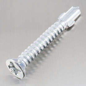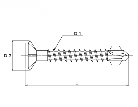特長 木板と鋼板の締結などに使用します。ドリルネジのドリル部とねじ部の間に2枚の羽が付いています。この羽によって木材へバカ穴を開けていきます。鋼板に当たると2枚の羽が折れるようになっています。