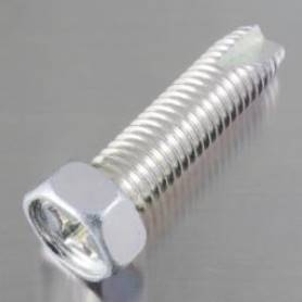 | 特長 | (+)C1アプセットと呼ぶタッピン3種(C1)です。タッピング3種は軸先端がテーパーになっており主に5舒幣紊慮板・鋳物・非鉄鋳物・構造用鋼に、またメートルねじ並目と同じ細かなピッチである事から小ねじと互換性があります。C1は軸の先端1/4周分をカットた刃によりねじ込み抵抗を低減しています。5舒焚爾慮板や非金属・樹脂・硬質ゴム等には2種(B0・B1)を、1.2舒焚爾稜鋼板・ハードボード・樹脂等には1種(A型)をと使い分けます。下穴にセルフタッピングして締結が出来、ナットやタップ立ての工程が省けます。ねじ込み抵抗は大きくなる為、十字穴ドライブはカムアウトし易くリセスをなめる事の無い様に注意が必要です。 頭部は十字穴付きの六角形状ですのでプラスドライバーだけでなくスパナ、レンチ等の複数の工具で締付け作業ができます。トリミングで加工する六角ボルトに比べると柔らかい印象があるため、装飾用に使用される事もあります。 下穴無しで使えるドリルねじと異なり、タッピングねじには下穴が必要です。 |