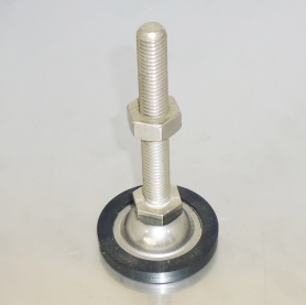 特長 アジャストボルト、アジャスターやアジャスターボルトとも呼ばれ、水平の保持や高さ調整を行うために自動販売機、制御盤、コンベヤー、事務機器などの下部に装着する、回転台座の付いたボルトです。こちらは標準タイプに滑り止めラバー(機械的強度が高く剛性があり耐久性に富んだポリ塩化ビニルコンパウンド製 非鉛)が付いた製品です。ラバー付の為、台座が土台からズレにくく振動に強く振動する機械設備やコンベアーの脚に最適な商品になっています。