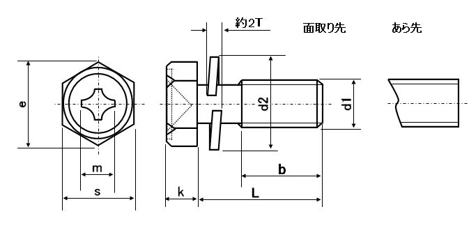 | 特長 | 六角アプセットボルトに緩み止めとして利用されるスプリングワッシャー(SW)が組み込まれています。脱落せず、組込みの手間もないので作業能率がアップします。 頭部の丸みのある六角柱の上面が平らに少し凹んでいて中央に十字溝があるのが六角アプセットボルトの特徴です。そのためボックスレンチ、スパナ、+ドライバー等、様々な工具で締め付け出来、複数の人が扱う場所や頻繁に付け外しが必要な個所でとても便利です。また比較的柔らかい印象の外観なので装飾目的に使用されることもあります。 「セムス(SEMS)」は1930年代に座金組込ねじを開発、特許を取得した米国イリノイツールワーク社の商標から来ています。日本での流通初期に、ねじとSWの2つの部品(2ピースPiece)でできたセムスを[P=2]、ねじとSW、平座金の3ピースの物は[P=3]と呼びました。その後、平座金だけ組み込んだものを[P=1]、座金がISO規格のときは[P]ではなく[I]を用いる、などアルファベットと数字の組み合わせで判別する事が定着しました。 →平座金の規格一覧はこちら |