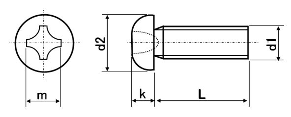 こちらはメートルねじです。ユニファイUNCUNF)と呼ばれるインチねじのご用意もあります。サイズはM2×15の様にメートルねじを意味するMに直径(呼び径d1)×長さ(呼び寸L)と単位mmで表記します。丸皿等を除き、一般にねじの長さに頭部の厚みは含めません。